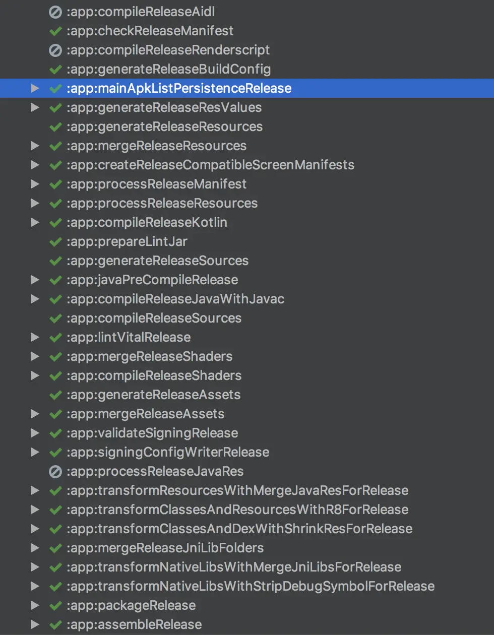 可以简单的看一下在buildType为release时build project执行的gradle任务: