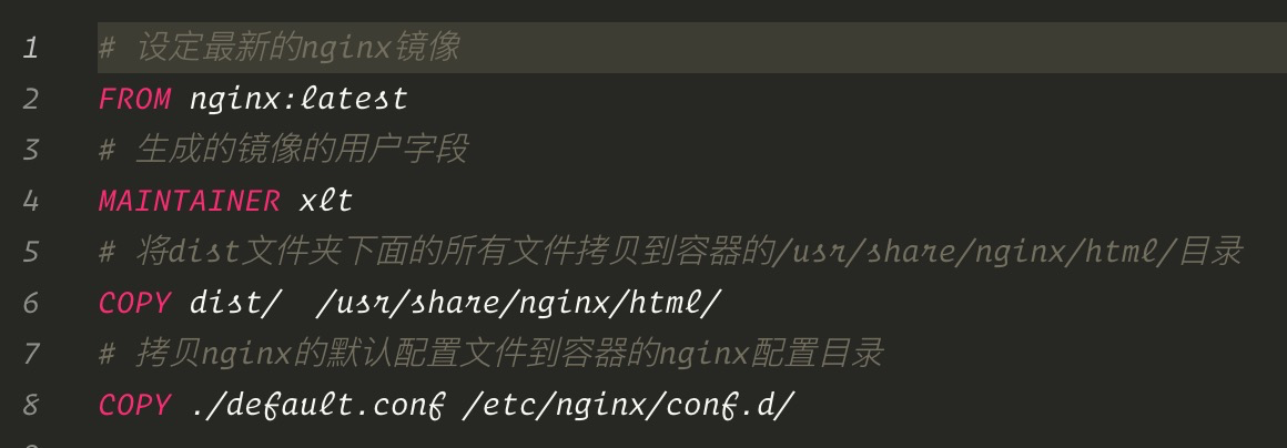 - 在工程中新建Dockfile配置文件,指定docker拉取的镜像文件以及相关的文件拷贝操作;新建default.conf文件,设置nginx的相关启动配置。Dockfile文件配置如下:
