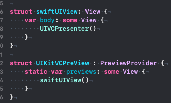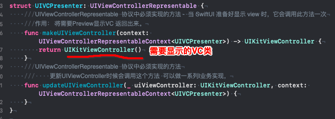 2. 创建一个中转结构体UIVCPresenter 遵循并实现UIViewControllerRepresentable 协议 这个结构体可以当做UIKit和SwiftUI的一个桥接。