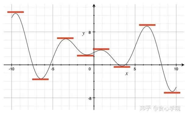人工智能中最核心的数学环节是求出一个目标函数(object function)的最小值/最大值。求出一个函数最小是/最大值的方法很多,在这里我们介绍一个最经典的方法之一:直接求出极值点。这些极值点的共同特点是在这些点上的梯度为0, 如下图所示。这个图里面,有8个极值点,而且这些极值点中必然会存在最小值或者最大值(除去函数的左右最端点)。所以在这种方式下,我们通常x先求出函数的导数,然后设置成为0。之后从找出的极值点中选择使得结果为最小值/最大值的极值点。