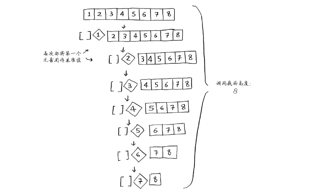 这种错误的选取方式就是把第一个元素或者最后一个元素用作枢纽元,如果输入的数组是随机的,那么这是可以接受的,但是如果输入是预排序或者是反序的,则会产生不平衡的问题,时间复杂度上升到。