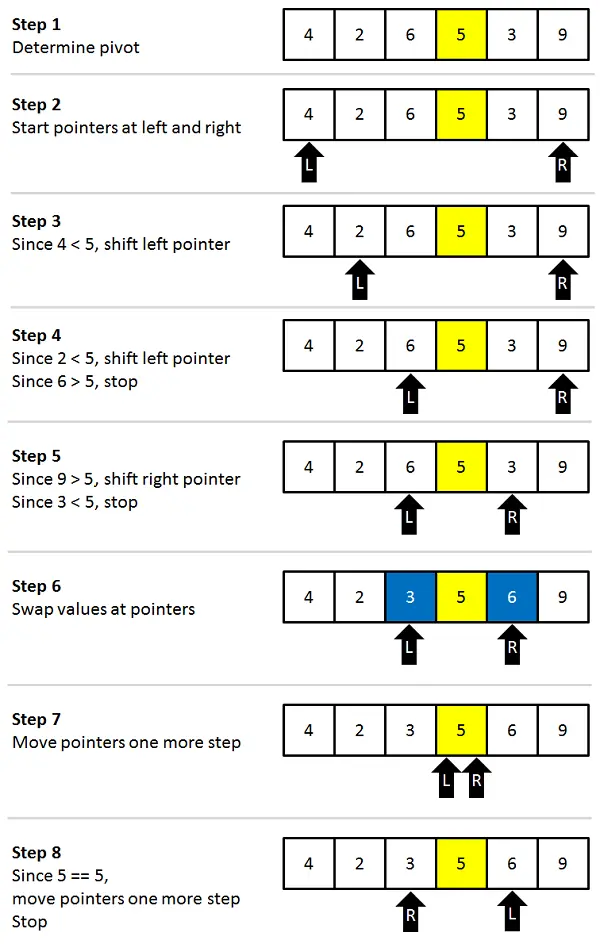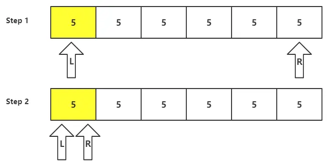 首先R指针左移寻找到第一个小于枢纽值的元素,注意:对于和枢纽元相同的元素采用的策略是不停(遇到相等元素时继续移动),所以右移会一直左移直到L == R结束,如下图所示: