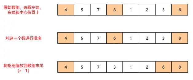 在综合考虑后,提出一种中值估计的方法----三数中值分割法,基本思路是:使用左端,右端和中心位置上的三个元素的中值作为枢纽元,其实是对中值的估计,选取过程: