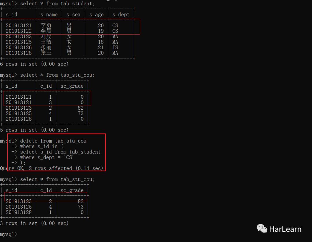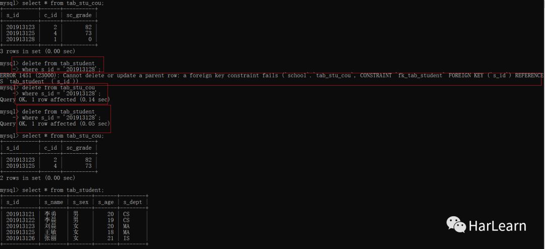 # 删除 tab_student 表中的一条记录delete from tab_studentwhere s_id = '201913128';# 在 tab_stu_cou 表中 删除 '201913128'这条记录 ,在执行上面删除就可以了delete from tab_stu_couwhere s_id = '201913128';