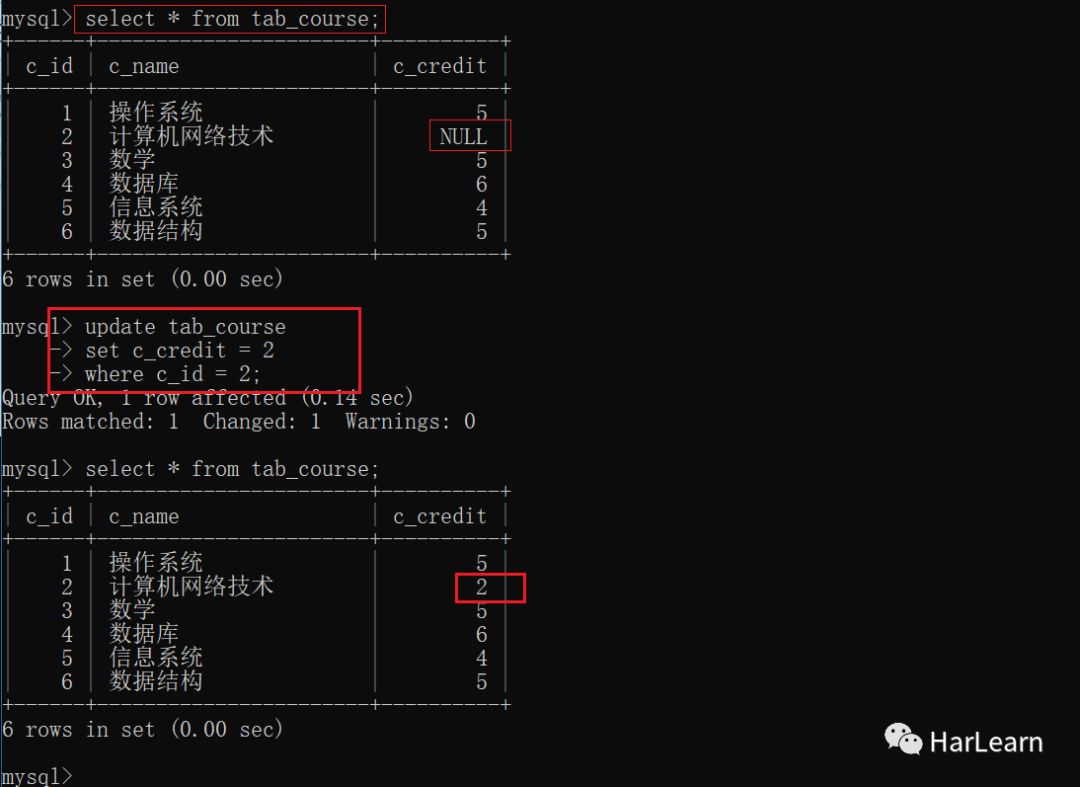 set子句给出 表达式的值用于取代相应的属性列值。where子句设置的 条件用于控制在表中修改操作的范围,省略where子句,则表示修改表中的所有数据。下面把 tab_course表中的空值(NULL)修改为2。代码如下: