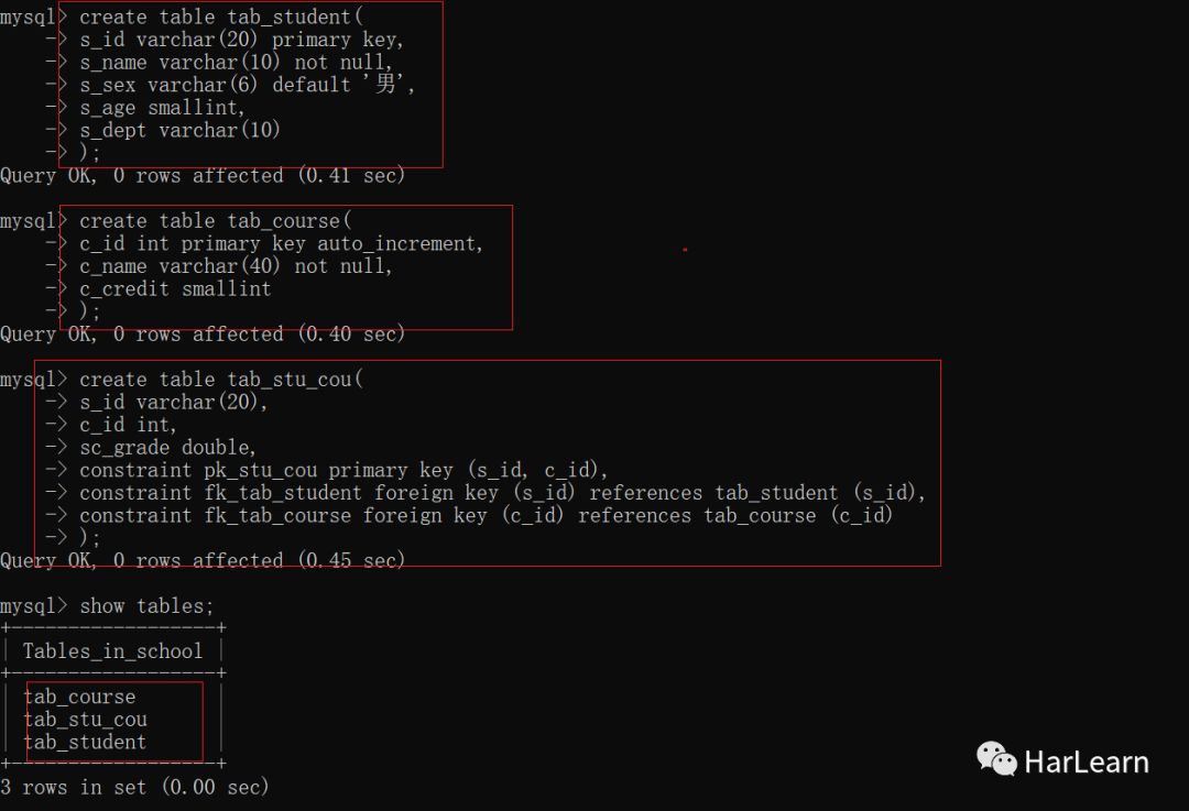 # 创建一个学生选课表create table tab_stu_cou( s_id varchar(20), c_id int, sc_grade double, constraint pk_s_c primary key (s_id, c_id), constraint fk_tab_student foreign key (s_id) references tab_student (s_id), constraint fk_tab_course foreign key (c_id) references tab_course (c_id));