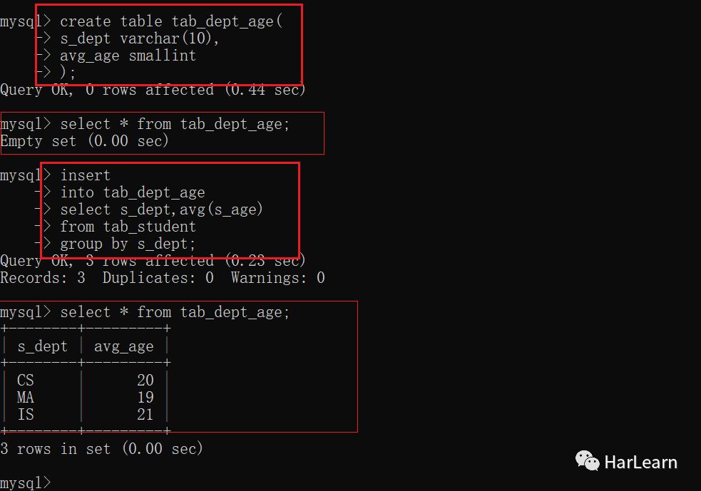 # 创建一个储存结果的表create table tab_dept_age(s_dept varchar(10),avg_age smallint);# 把查询结果 添加到 tab_dept_age 表中insertinto tab_dept_ageselect s_dept,avg(s_age)from tab_studentgroup by s_dept;