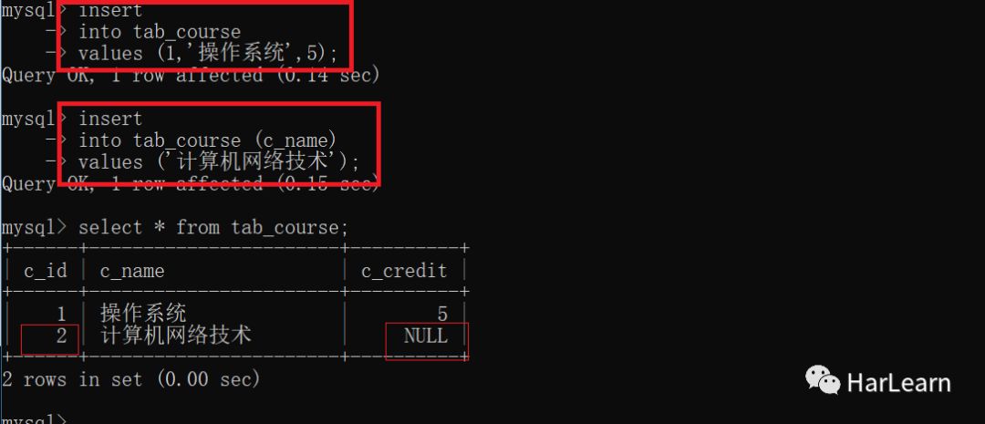 # 在tab_course 表中插入一条完整数据 ,省略版insertinto tab_coursevalues (1,'操作系统',5);#在tab_course表中插入部分数据insertinto tab_course (c_name)values ('计算机网络技术');