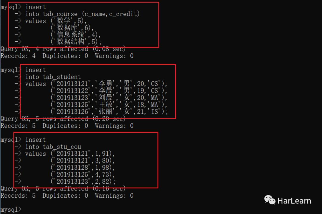 # 在课程表中添加多条数据insertinto tab_course (c_name,c_credit)values ('数学',5), ('数据库',6), ('信息系统',4), ('数据结构',5);# 在学生表中添加多条数据insertinto tab_studentvalues ('201913121','李勇','男',20,'CS'), ('201913122','李晨','男',19,'CS'), ('201913123','刘晨','女',20,'MA'), ('201913125','王敏','女',18,'MA'), ('201913126','张丽','女',21,'IS');# 成绩表中添加多条数据insertinto tab_stu_couvalues ('201913121',1,91), ('201913121',3,80), ('201913128',1,98), ('201913125',4,73), ('201913123',2,82);