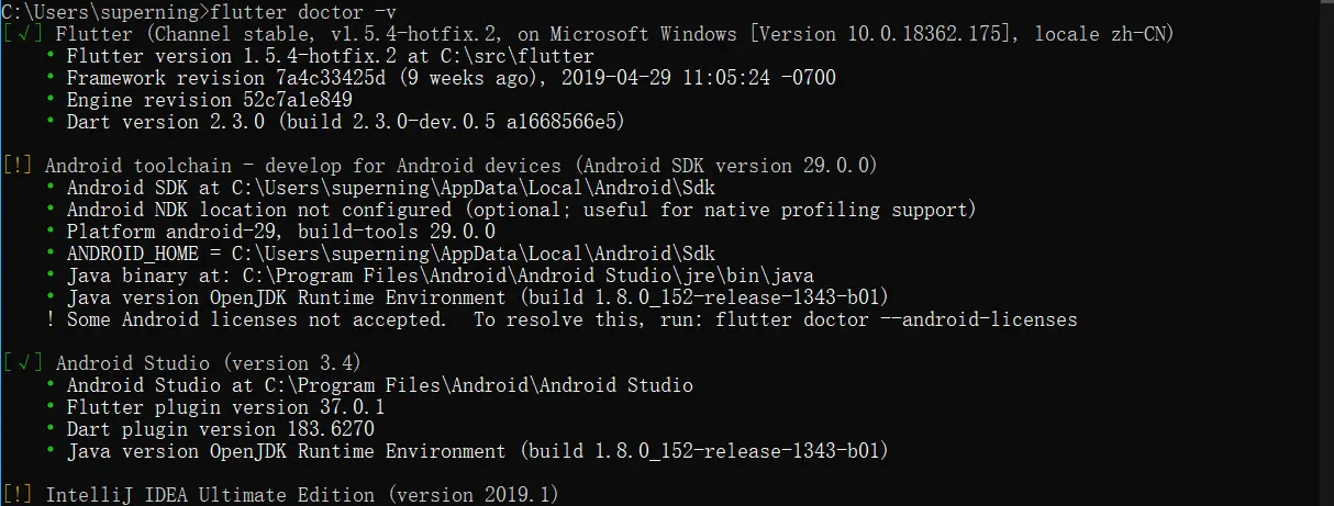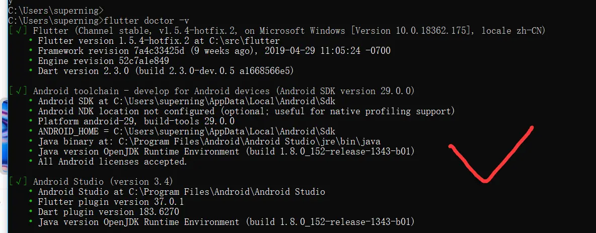 奈斯,现在终于出现我们想要的结果了,接受所有的license后,我们再次运行 flutter doctor -v
