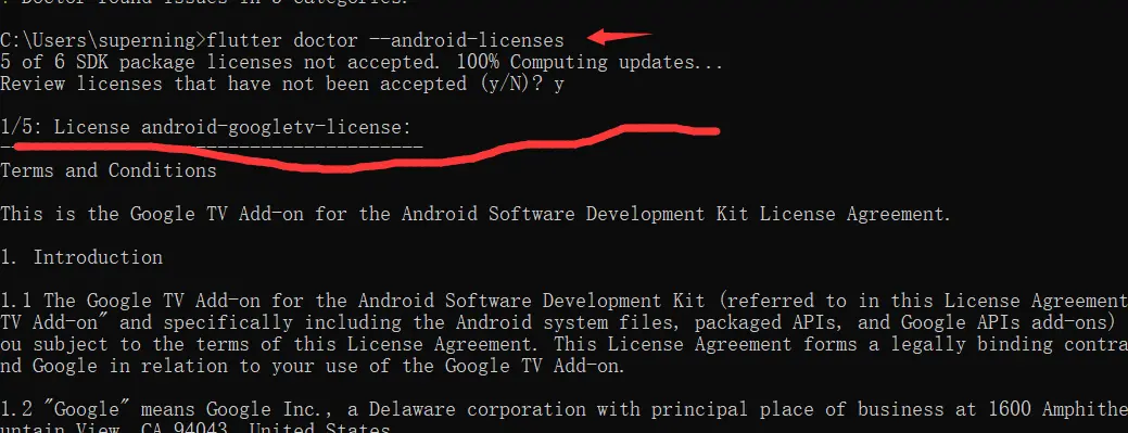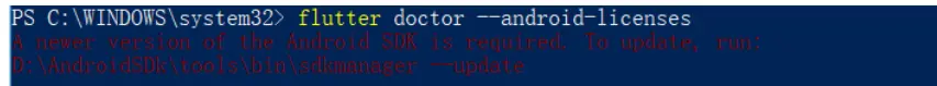 现在已经没有之前的this is taking an unexpectedly long time问题,只显示我们需要运行flutter doctor --android-licenses,那我们之前运行flutter doctor --android-licenses是会出错的,那现在呢???
