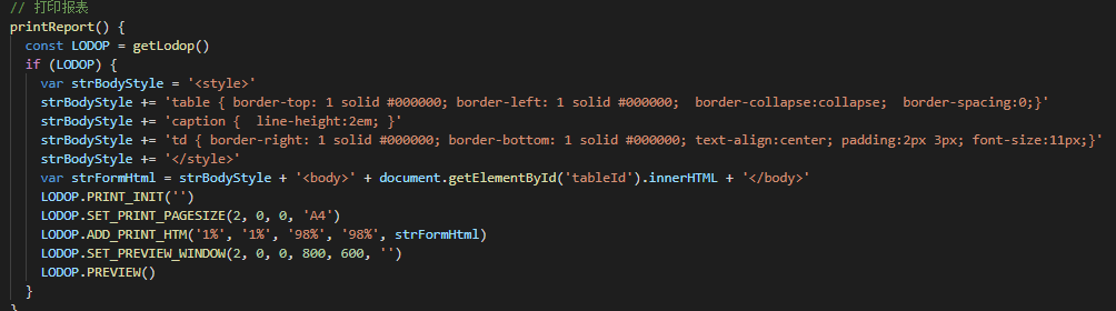 打印报表的方法进行代码编写,主要程序就三行代码 let LODOP = getLodop()//调用getLodop获取LODOP对象