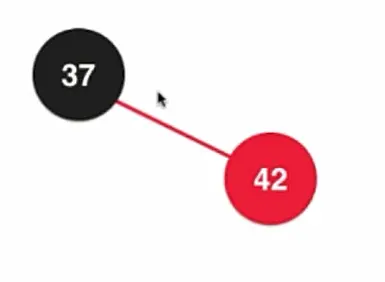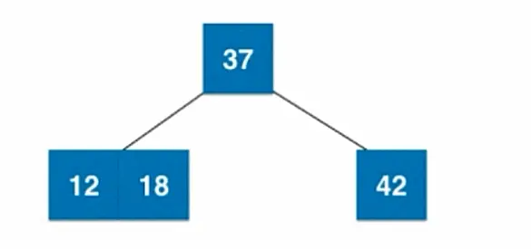 对于只有一个节点的2-3树(设这个节点值为42)在添加新节点(设值为37)时首先检查根节点的左子树,若为空则融合两个节点。若继续添加一个值为12的节点,由于新节点不能添加到一个空的位置,所以只能继续和根节点融合,暂时形成一个4节点,如图