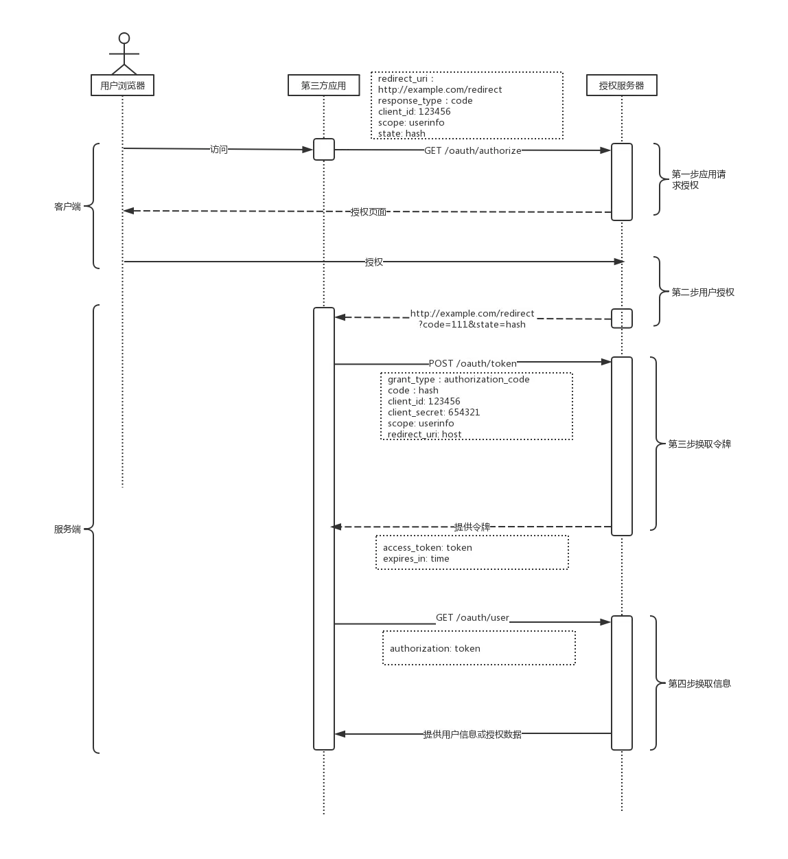 为了方便和专注于我们今天所讨论的主题,所以我将OAuth2.0框架所定义的角色和流程缩减为下图的三个角色、四步流程。(需要格外关注的是除第一步用户授权流程是 第三方应用的客户端 与 授权服务器 进行通信,其他流程均在 第三方应用的服务端 与 授权服务器 间通信完成)