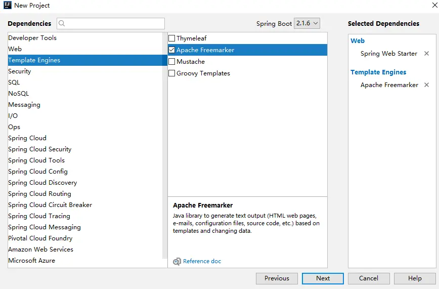 首先创建一个 Spring Boot 工程,引入 Freemarker 依赖,如下图: