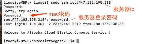 命令行输入:sudo ssh root@[你的服务器ip]