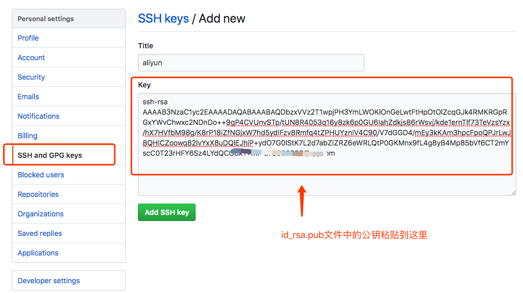 将前面生成的 id_rsa.pub 中的内容粘贴到 Key 文本框中,随意输入一个 title(不要有中文),点击 Add Key 即可。