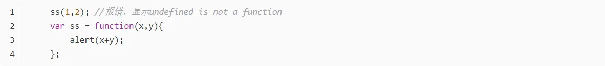 这种形式看起来像是常规的变量赋值语句。但函数表达式和函数声明的区别是函数表达式在使用前必须先赋值。所以接下来看到的代码执行时会出错: