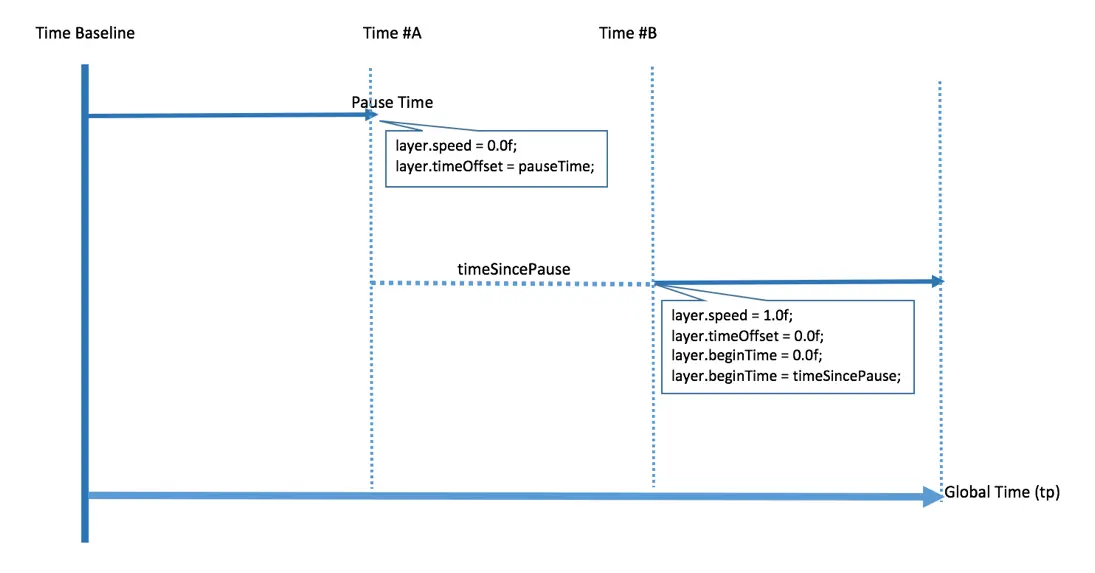 答:动画时间点的计算满足一个公式,t = (tp - begin) * speed + offset,设置timeOffset使得公式在speed等于0的情况下,动画的时间点(或位置)等于暂停时的时间(或位置)