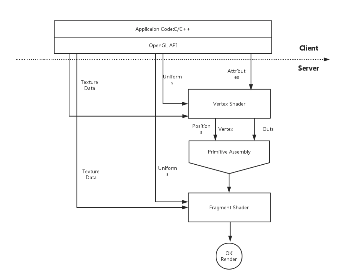 客户端是存储在CPU存储器中的,并且在应用程序中执行,或者在主系统内存的驱动程序中执行(我们写的代码,OpenGL 提供的API就是在客户端执行)