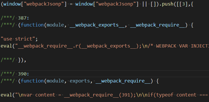 eval执行,能映射到每个模块的代码,但是代码只能看到生成后的代码,打包和构建的速度都很快(不需要复杂转换和打包),但是不能定位到源码的真实位置