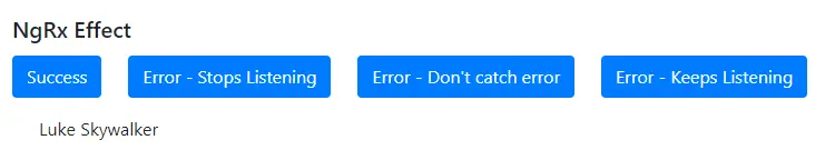 Success- 用person/1(Luke Skywalker)调用星球大战 API,并在屏幕上输出名称Error – Stops Listening- 使用错误 URL 调用 API,因此它会生成一个错误 -catch是错误的,所以它停止监听effectError – Don’t catch error- 使用错误的 URL 调用 API,以便生成错误 - 不捕获错误Error – Keeps Listening- 使用错误的 URL 调用 API,以便生成错误 - 正确捕获错误,所以可以多次单击它
