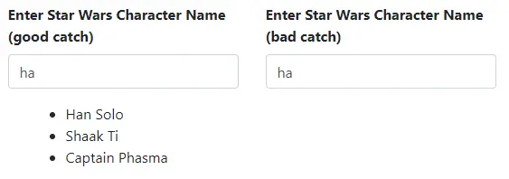 它在 300 毫秒内去抖动,并且使用distinctUntilChanged确保我们不会连续两次搜索相同的东西. 在 switchMap 中, 我们使用了searchStarWarsNames方法,并且使用catchError方法捕获错误. 这有什么问题吗?