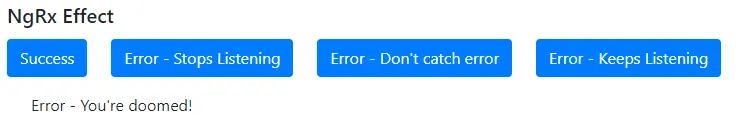 在这种情况下, catchError 会在 this.actions$.pipe 的第一层中别调用, 从而结束 effect,因为它的 Observable 流将结束. 这就像上面使用 RxJS Observables 的案例研究一样. 点击后我们应该在页面上看到Error – You’re doomed!. 如果我们再次尝试单击该按钮,则不会触发该effect.