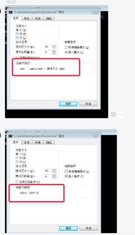 修改完毕后,会发现在cmd属性的"选项"栏中的"当前代码页"的字符设置已经修改为65001(UTF-8)
