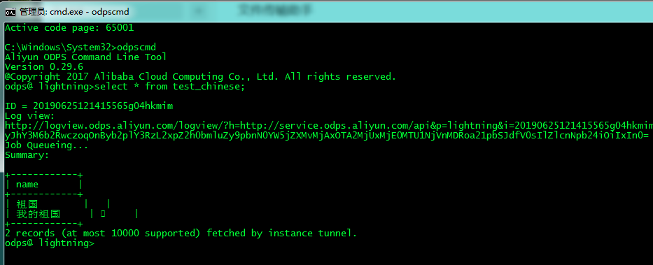 Windows用户下载配置配置客户端(odpscmd)后,在查询包含中文字符的表数据时,会出现乱码情况,如下图所示:
