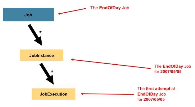 JobInstance是指批处理作业运行的实例。例如一个批处理必须在每天执行一次,系统在2019年5月1日执行了一次我们称之为2019-05-01的实例,类似的还会有2019-05-02、2019-05-03实例。