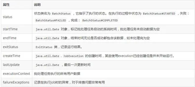 Job用于定义批处理如何执行,JobInstance纯粹的就是一个处理对象,把所有的运行内容和信息组织在一起,主要是为了当面临问题时定义正确的重启参数。而JobExecution是运行时的“容器”,记录动态运行时的各种属性和上线文。他包括的信息有: