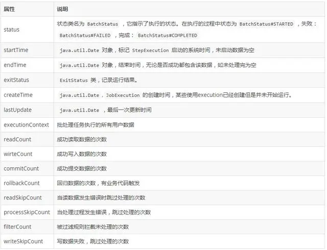 StepExecution表示单次执行Step的容器,每次Step执行时都会有一个新的StepExecution被创建。与JobExecution不同的是,当某个Step执行失败后默认并不会重新执行。StepExecution包含以下属性: