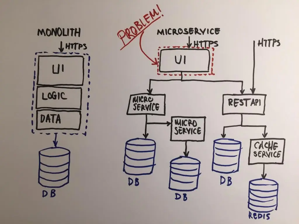 从上图可以理解,微服务中的每个服务都是一个独立的应用,除了UI。 UI仍然是一体的! 当一个团队处理所有服务并且公司正在扩展时,前端团队将开始苦苦挣扎并且无法跟上它,这是这种架构的瓶颈。