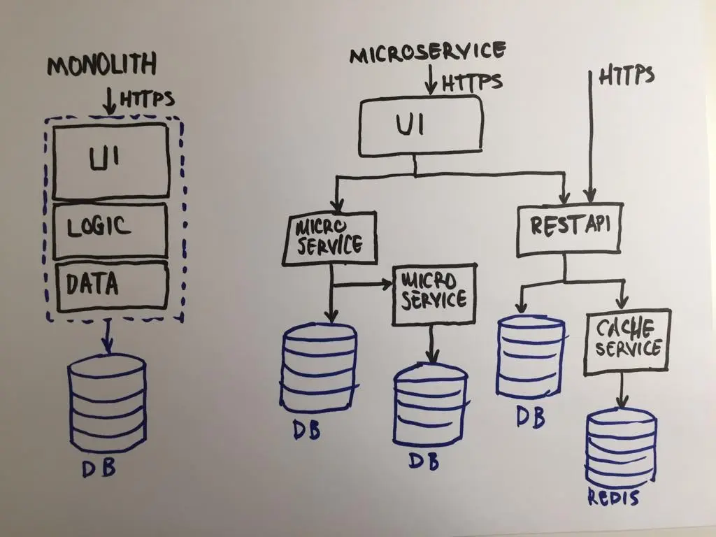 我画了一个简单的草图,为整体和微服务提供了直观的解释: