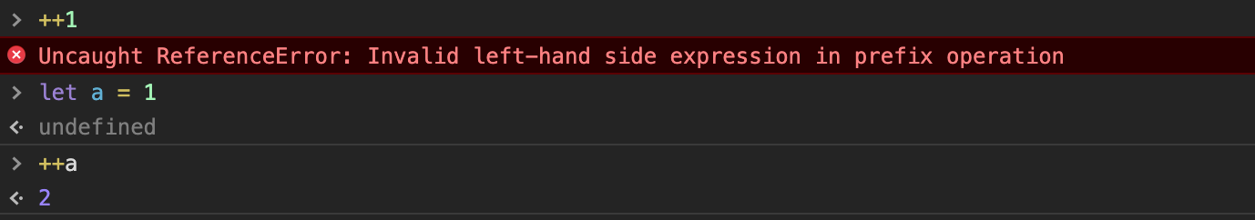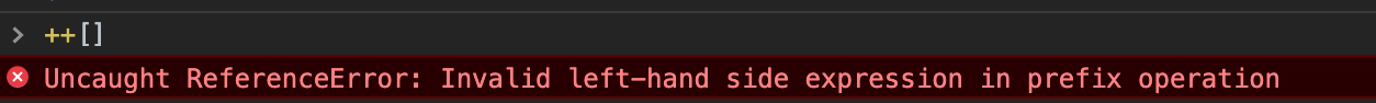 由于++的优先级比+高,所以先算左边的++[[]][0],仔细观察这个表达式[[]][0]这一块的结果其实就是[],那么++[[]][0]就等于++[],可是当你在控制台中输入++[]却会报错: