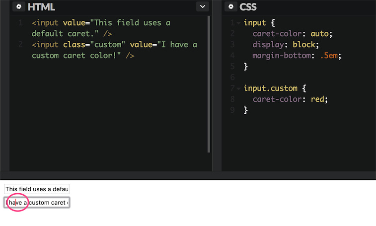 <input class="custom" value="I have a custom caret color!" />