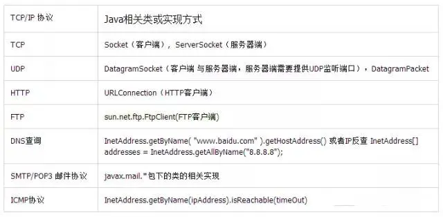 在网络程序开发中,操作系统都为我们提供了全面 方便的应用层网络操作类与接口,使得程序员在使用过程中无需考虑协议栈的细节,而专心于数据的传输处理过程中。当然,操作系统也为程序员提供了可以掌控协议细节的机会,例如使用原始套接字(Raw Socket)可以控制TCP的三次握手的细节实现TCP SYN扫描(注意部分 Windows 7系统不支持原始套接字的半开扫描)。但是在大多常规网络应用开发中,我们都直接使用系统提供的应用层接口来实现网络程序。这里我们罗列出在Java中常见的TCP/IP协议的实现类或方法,如下表所示: