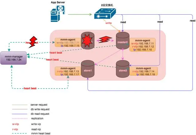 如上所示,整个MySQL集群提供1个写VIP(Virtual IP)和N(N>=1)个读VIP提供对外服务。每个MySQL节点均部署有一个Agent(mmm-agent),mmm-agent和mmm-manager保持通信状态,定期向mmm-manager上报当前MySQL节点的存活情况(这里称之为心跳)。当mmm-manager连续多次无法收到mmm-agent的心跳消息时,会进行切换操作。