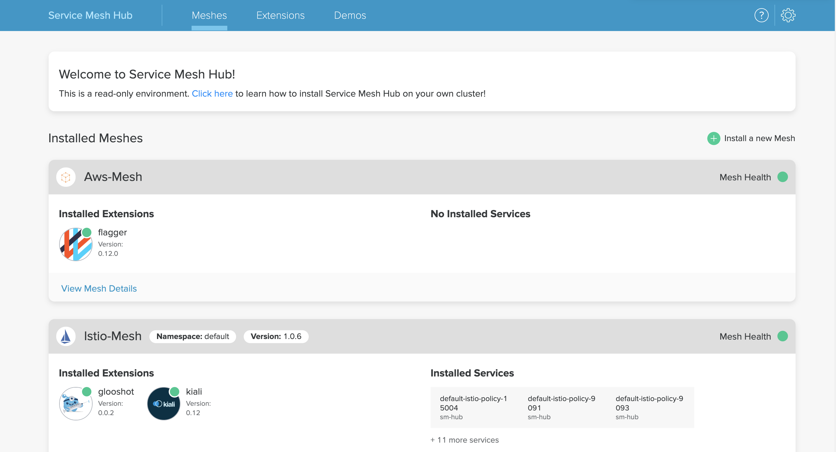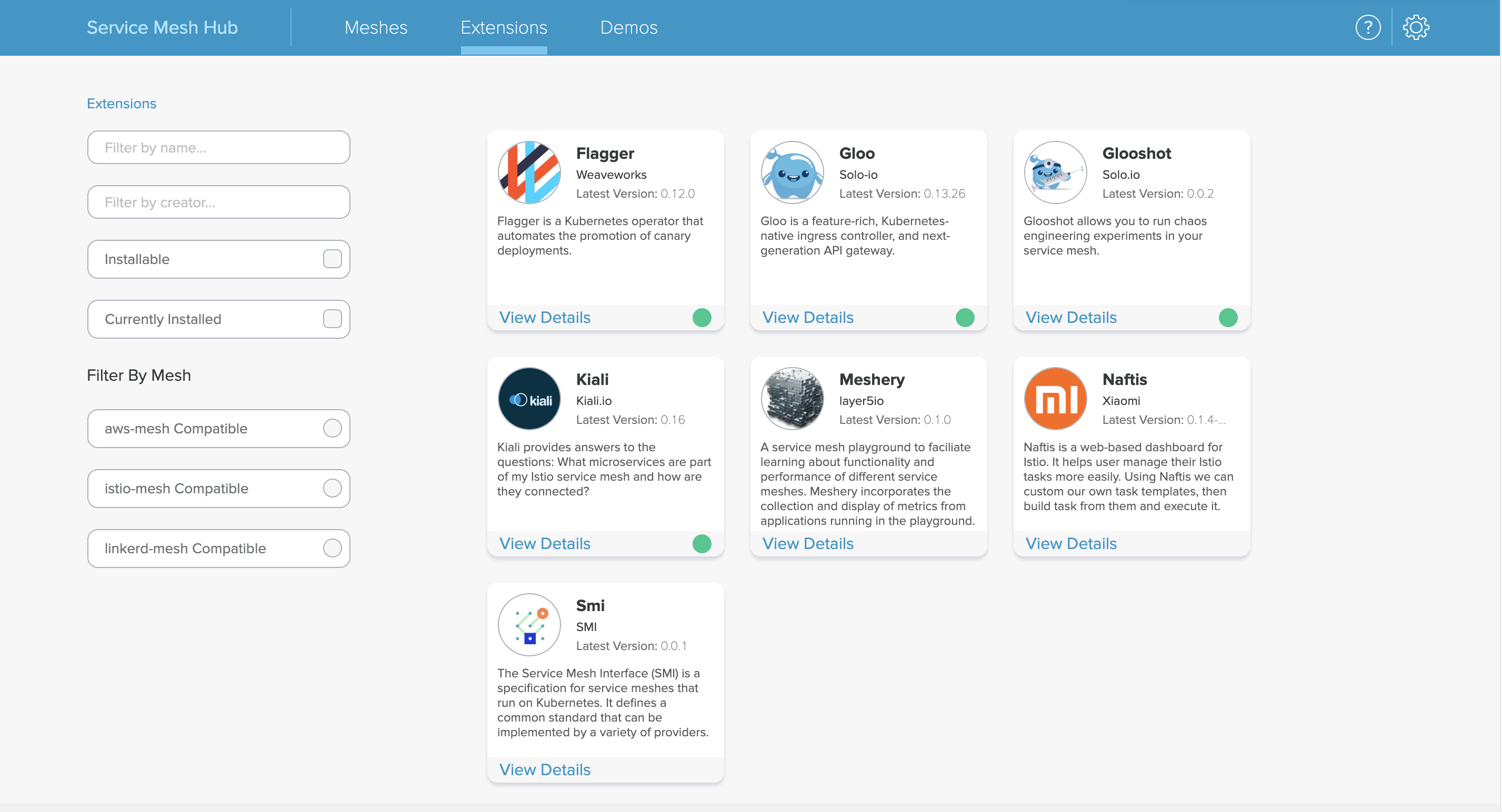 Service Mesh Hub : solo.io 开源的 Service Mesh 仓库,提供了一个 Dashboard 用来发现和部署不同类型的 Service Mesh,也可以管理每个 Service Mesh 的扩展。