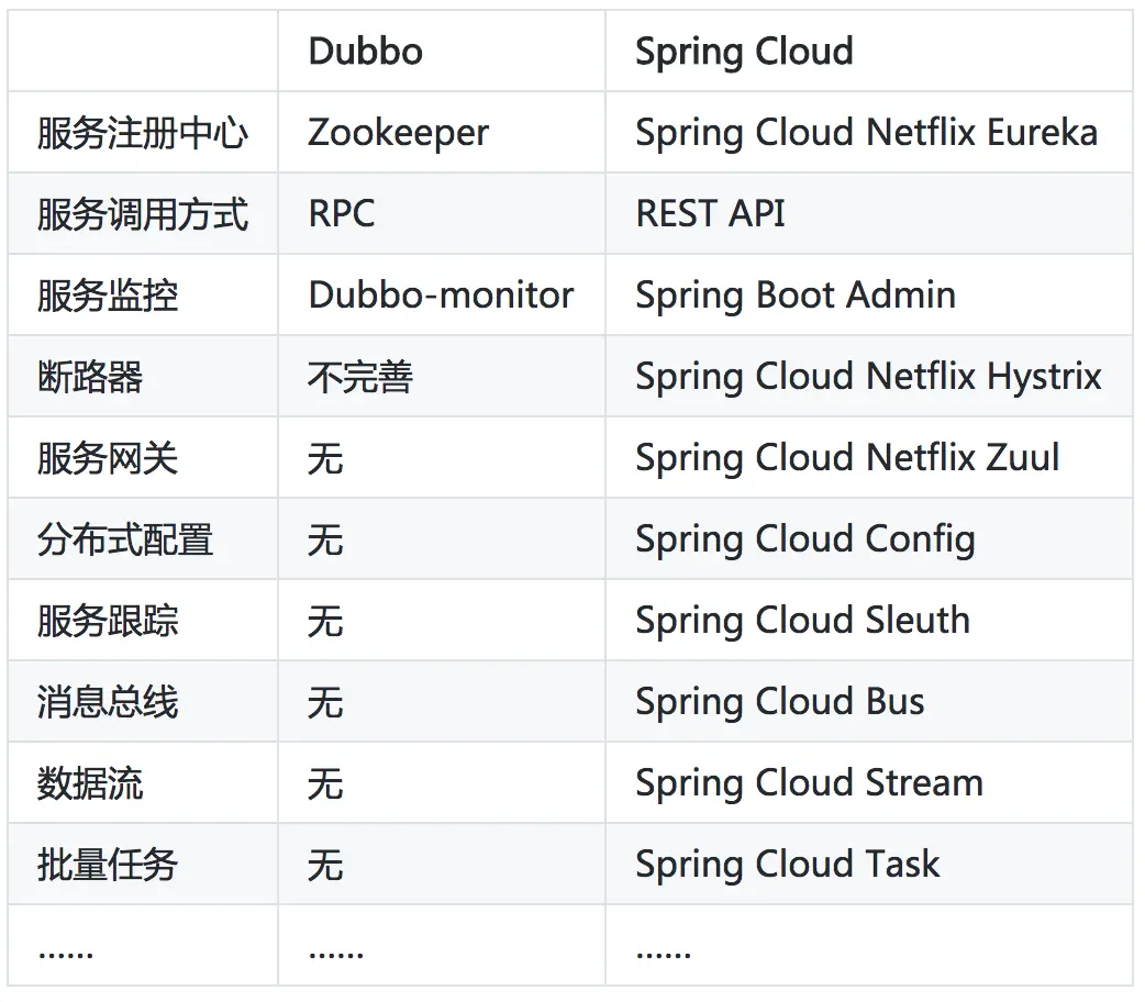 springcloud: springcloud是一整套的微服务解决方案,有一张很有名的对比图可以清晰看到dubbo和springcloud功能对比,如下: