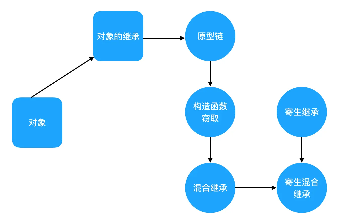 回到之前的问题,JavaScript 为什么能够在没有类的基础上实现面向对象?这个问题现在应该也不难解释了,一切都在这个图中,细致的去想,图中的模式也很好地展示了面向对象中的抽象、封装、继承和多态,只是说实现的方法和一般我们所了解的语言不太一样。从这张图中你也可以看到知识的迭代,这张图中的每个圆圈其实是一个个知识点,如果你把这些知识点换做成技术,你会发现一个新技术的出现其实是为了解决或者说是弥补之前技术的不足和缺陷,每当我们学习一项新的技术的时候,不妨去想想这个技术是从其他的什么技术演变而来的,它为了解决什么问题,这些问题为什么之前的技术解决不了?将你的知识体系化,这样久而久之就能够融会贯通。