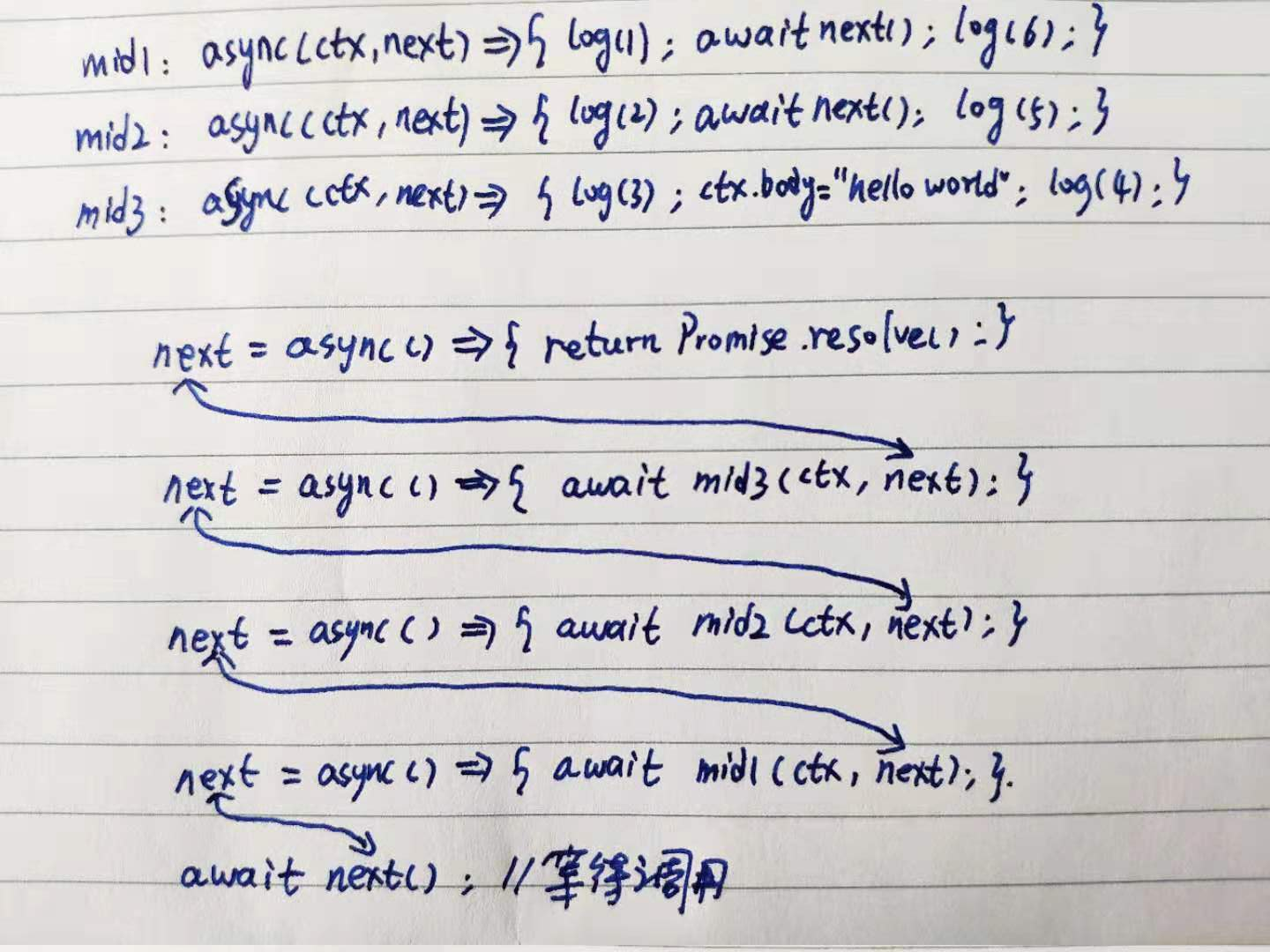 上述代码的关键是createNext函数,将下一个应该被调用的middleware包裹在async函数中;