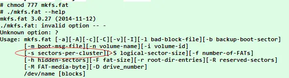 但发现我们设备的mkfs.vfat不支持-s参数设置簇的大小。