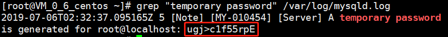 grep "A temporary password" /var/log/mysqld.log # 查看结果如下图所示