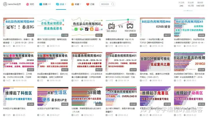 在感叹的同时,小笨聪也很好奇这类可视化图表是怎么制作的?便找到了作者 Jannchie见齐的 B 站主页:space.bilibili.com/1850091/cha…