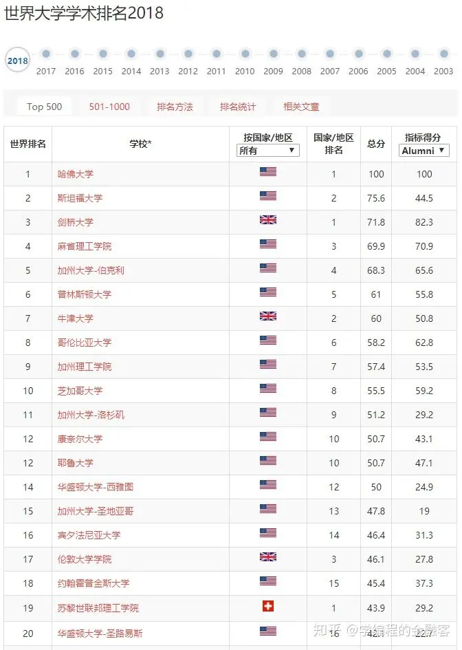 这里,我们选取相对比较权威也比较符合国情的第一个 ARWU 的排名结果。打开官网,可以看到有从2003年到2018的英文版和中文版排名,这里选取中文版。