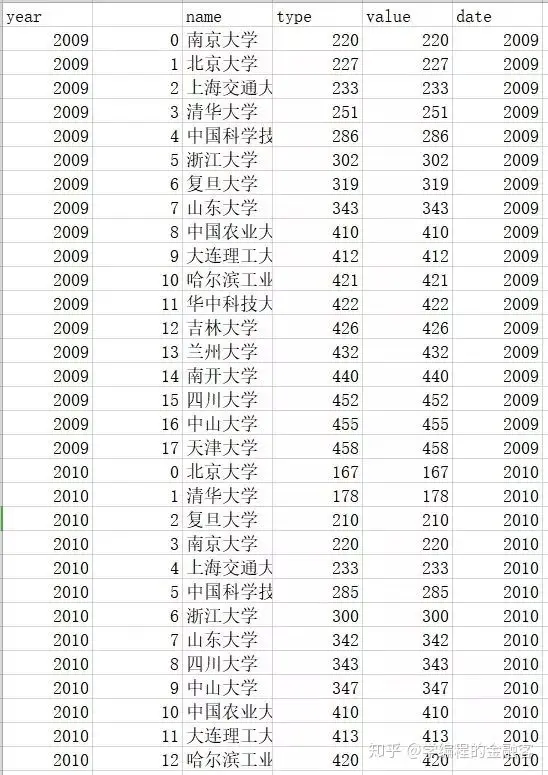 将前面生成的 university.csv 文件进一步处理。另外,这次的代码不仅可以获得内地大学排名,还可以列出含港澳台的排名和美国大学的排名。小笨聪也定义了一个 topn 函数,能够按年份分别求出各年的前20名大学名单。