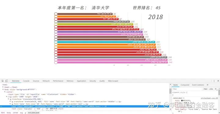 首先到 见奇 的 Github 主页下载源码,然后将 bargraph.html 拖拽到浏览器,点击 选择文件,将刚才下载好的 university_ranking.csv 文件选中,即可看到动态数据图表。
