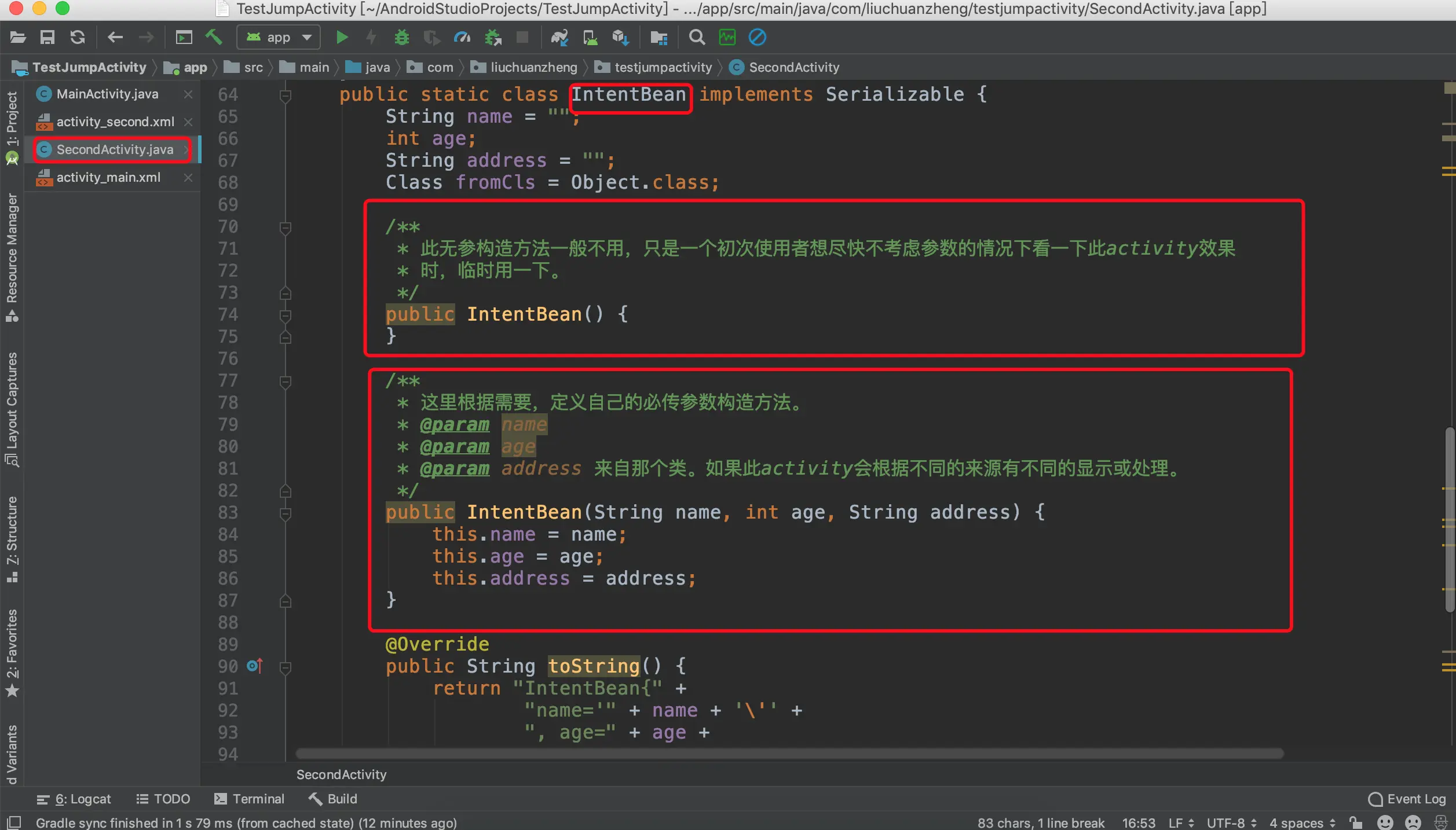 1在SecondActivity中定义需要外界传递的对象,名字固定为IntentBean。通过构造方法规定必传参数